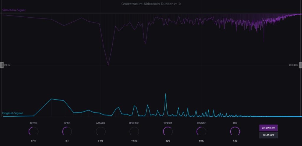 - Real-time Spectral Display: A gorgeous visualizer with a logarithmic frequency axis from 20 Hz to 20 kHz, showing the spectra of both the sidechain and the original signal.